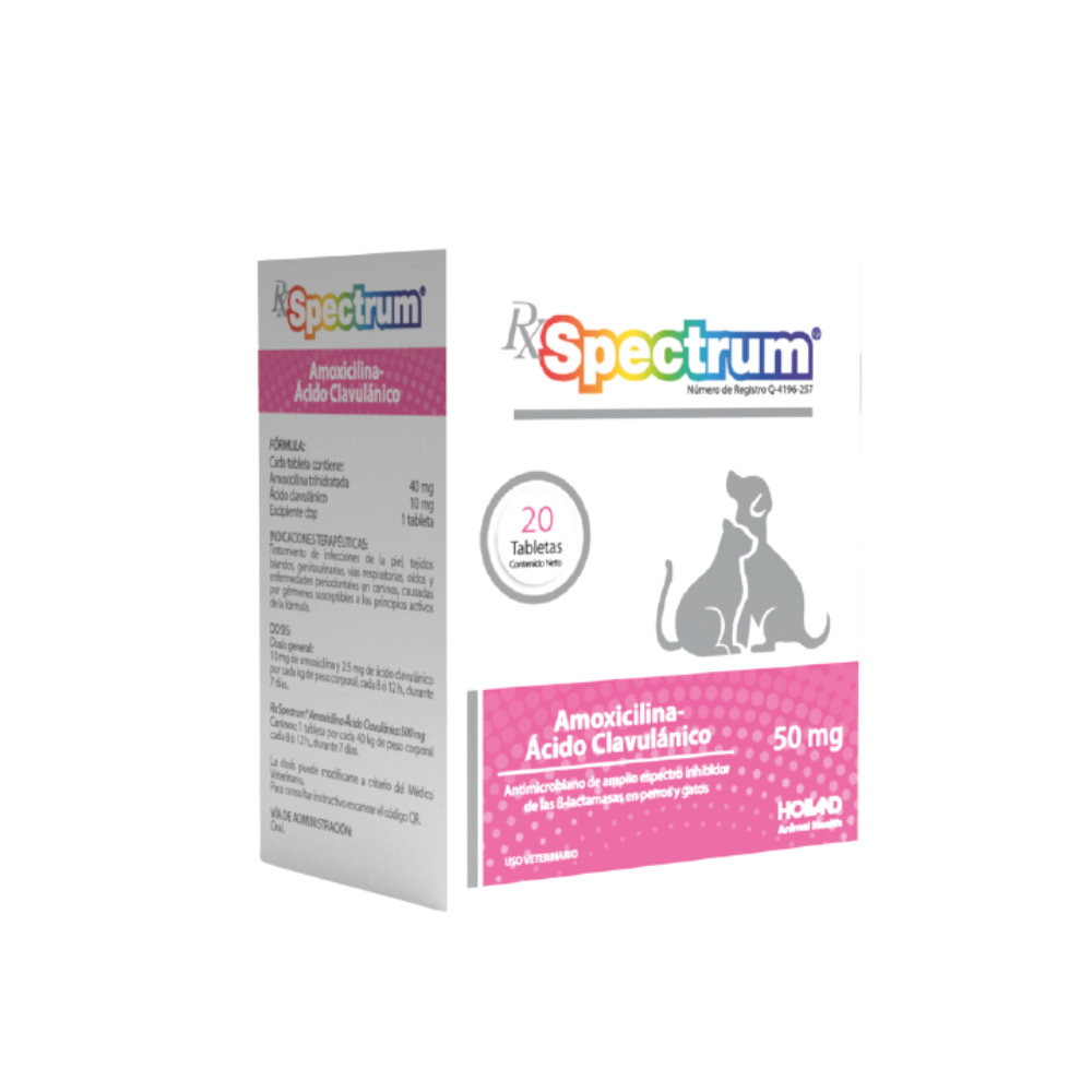Rx Spectrum Amoxicilina-Ac. Clavulanico 50 (Amoxi 40Mg/Ac. Clav 10Mg) 20Tab Antibiótico veterinario de amplio espectro indicado para el tratamiento de...