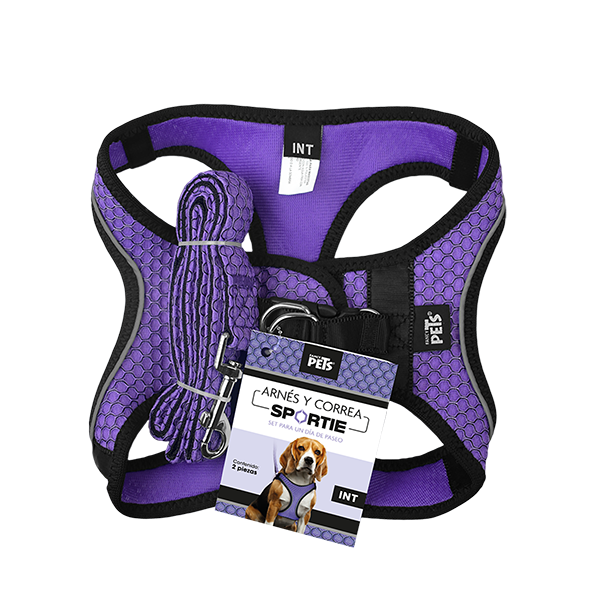 set de arnés y correa deportivo en color violeta intenso, diseñado para brindar comodidad, seguridad y estilo en los paseos...