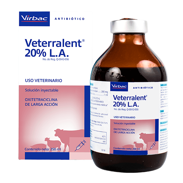 Veterralent 20 % L.A. 250 ml Antibiótico inyectable de acción prolongada para el tratamiento eficaz de infecciones en bovinos, porcinos,...