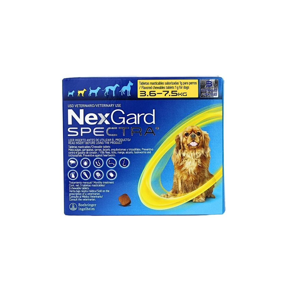 nexgard spectra s es un antiparasitario masticable de amplio espectro para perros de 3.6 a 7.5 kg, que elimina pulgas,...
