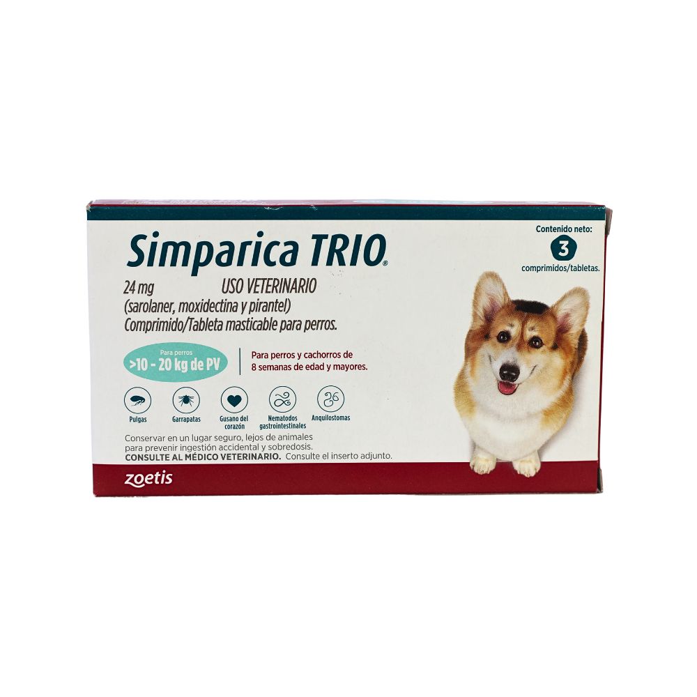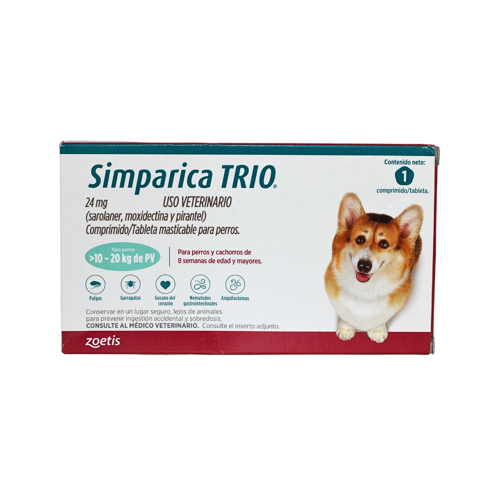 simparica trio 24 mg es un antiparasitario de amplio espectro diseñado para proteger a perros de 10 a 20 kg...