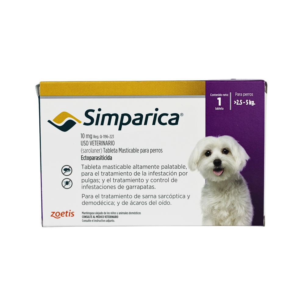 Simparica 10 mg es una tableta masticable que protege a perros de 2.5 a 5 kg contra pulgas, garrapatas y...