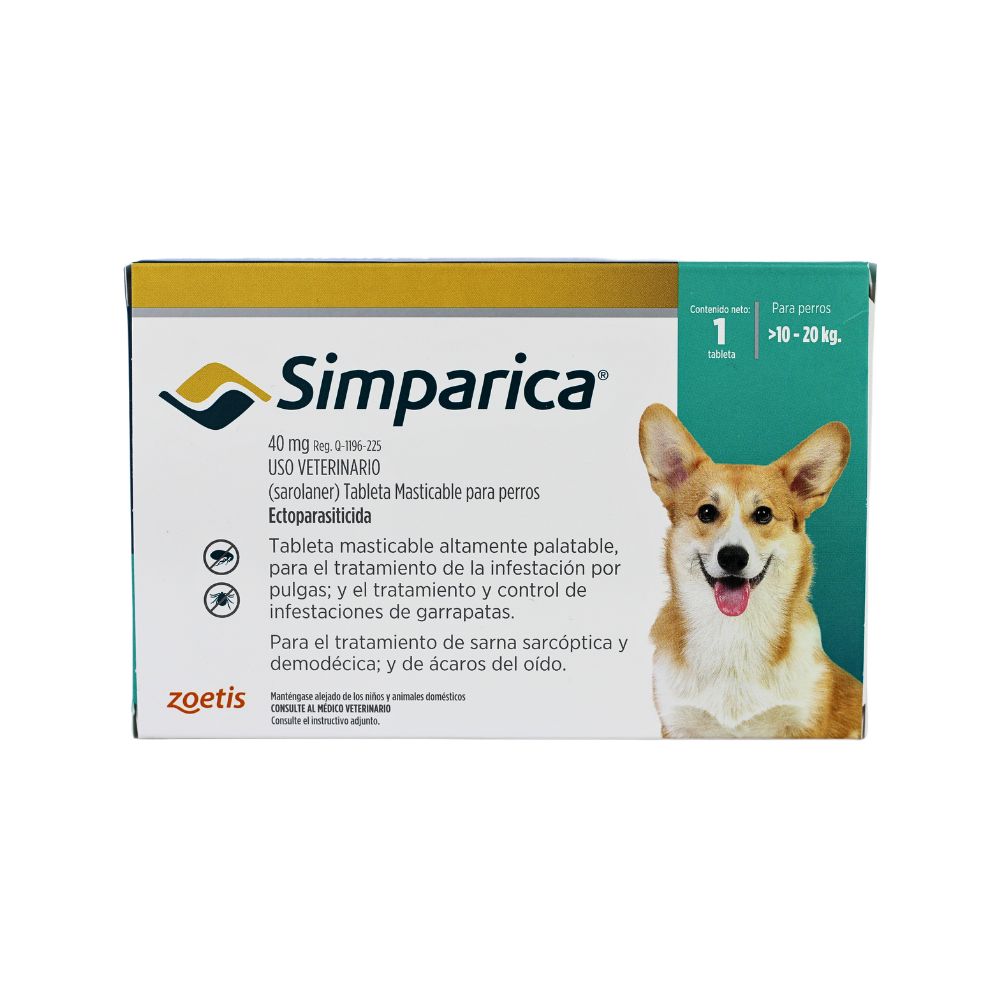Simparica 40 mg es un antiparasitario oral efectivo que protege a perros de 10 a 20 kg contra pulgas, garrapatas y...