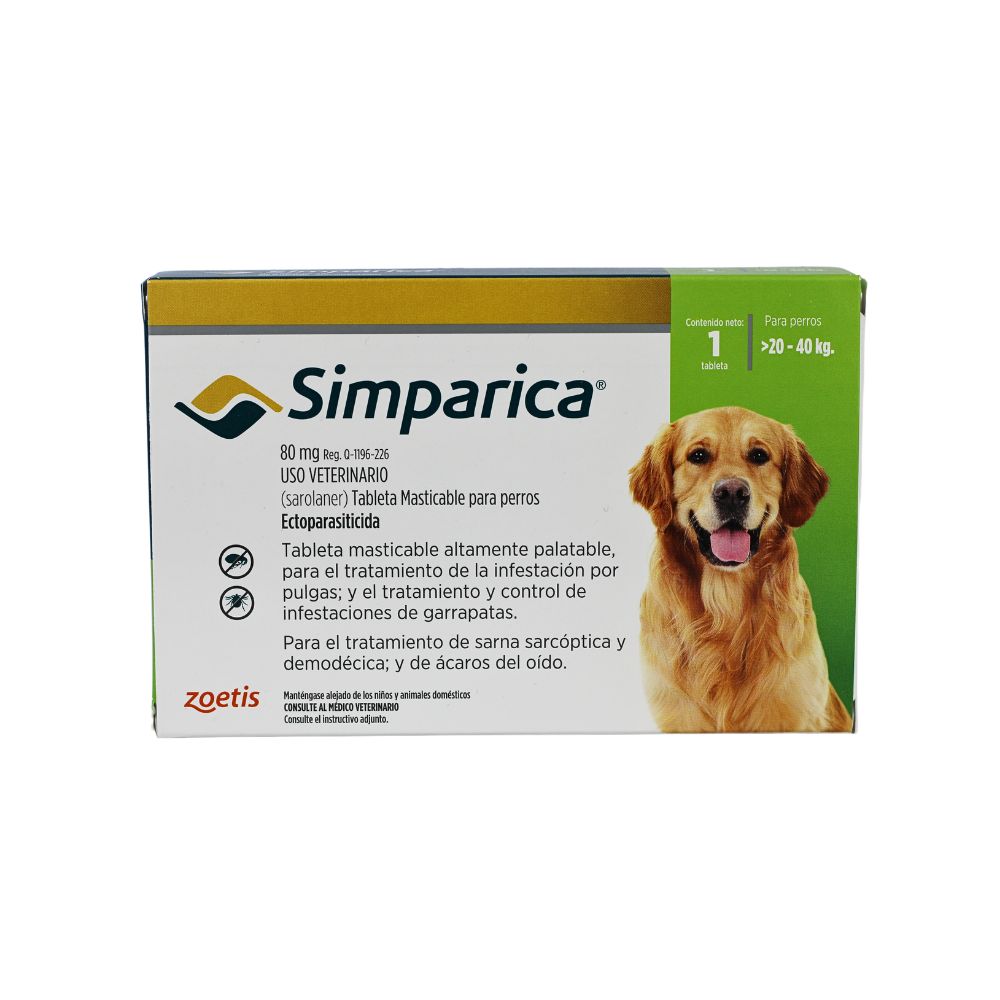Simparica 80 mg es un antiparasitario oral diseñado para proteger a perros de 20 a 40 kg contra pulgas, garrapatas...