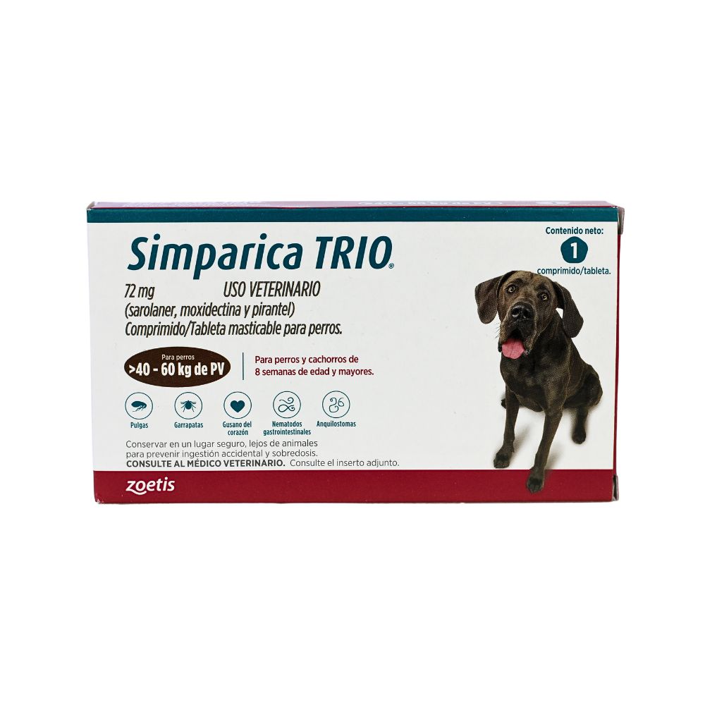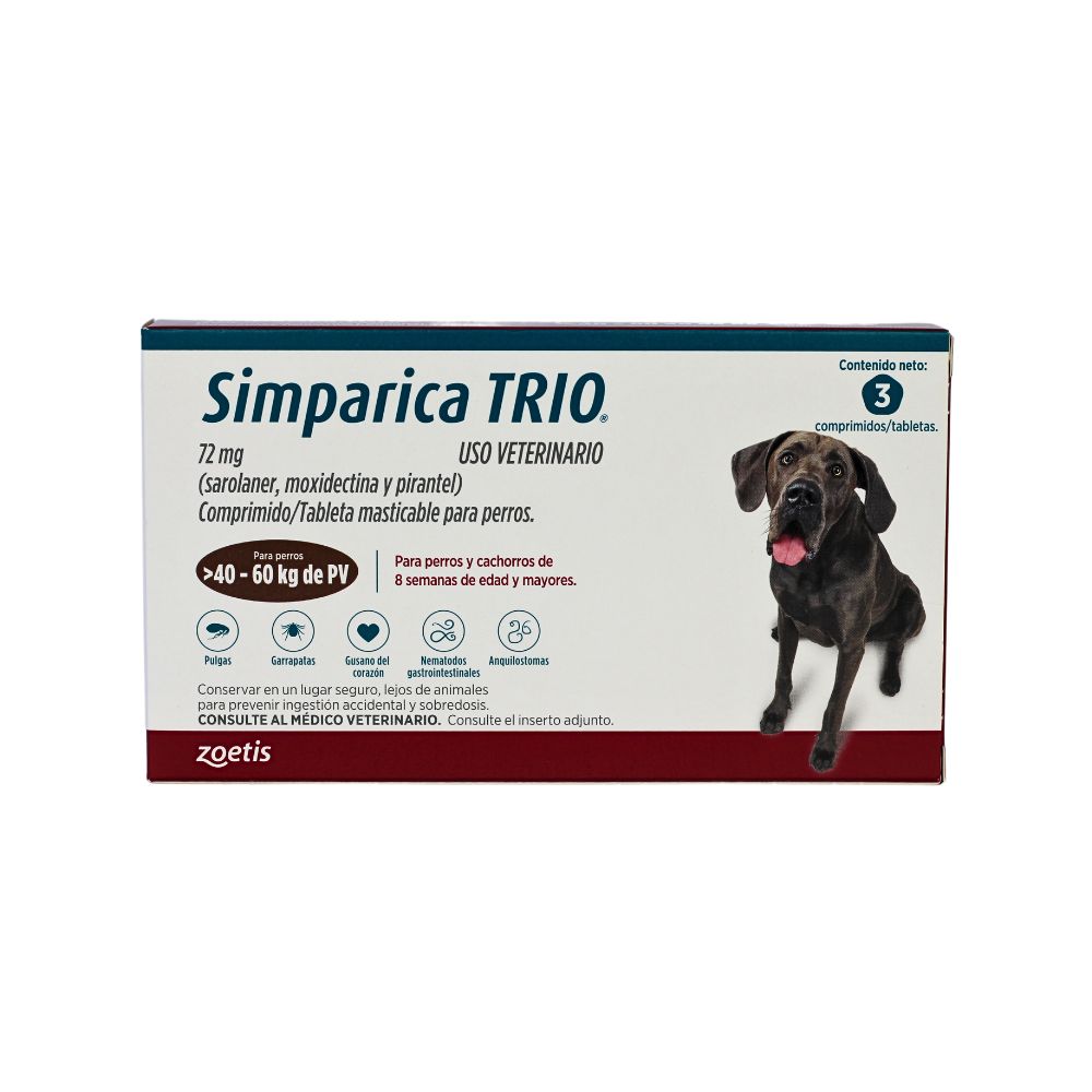 simparica trio 72 mg es un antiparasitario integral formulado para proteger a perros de 40 a 60 kg contra pulgas,...