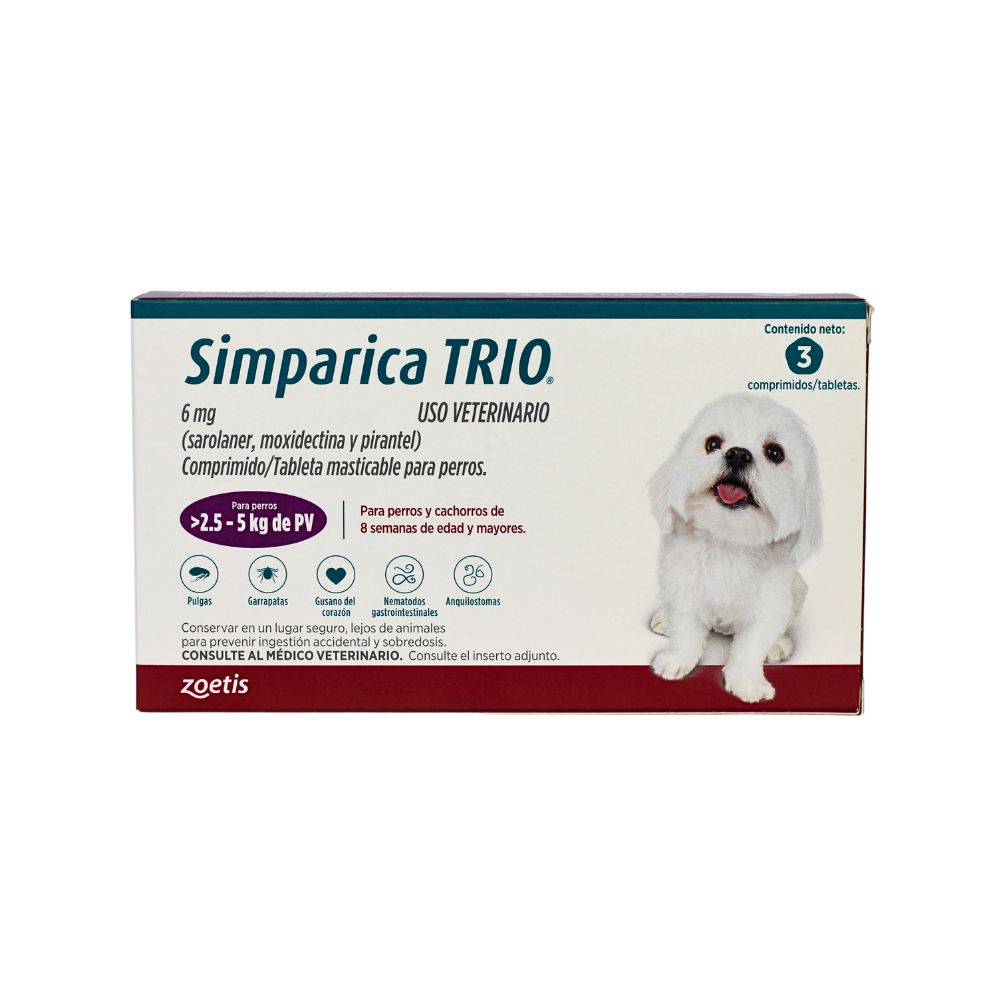 simparica trio 6 mg es un antiparasitario de amplio espectro diseñado para perros de 2.5 a 5 kg, que protege...
