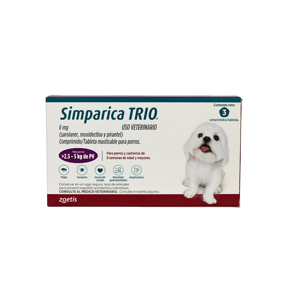 Simparica trio 6 mg es un antiparasitario de amplio espectro diseñado para perros de 2.5 a 5 kg, que protege...