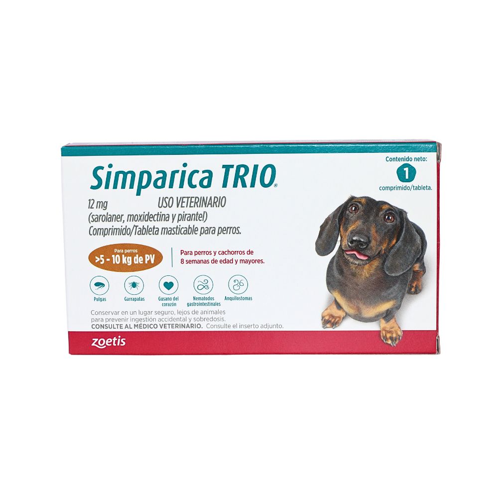 Simparica Trio 12 mg es un antiparasitario de amplio espectro para perros de 5 a 10 kg, que ofrece protección...