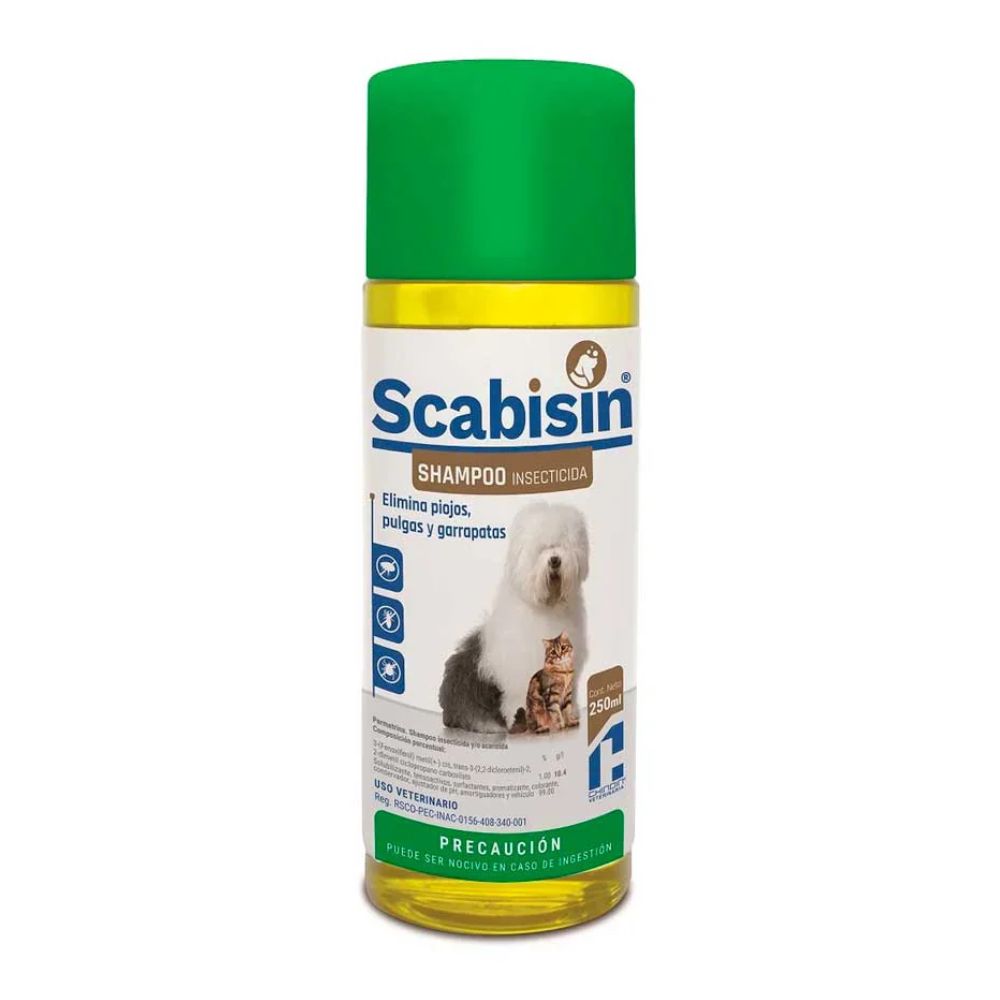 scabisin shampoo 250 ml es un shampoo insecticida está indicado en la limpieza y acondicionamiento del pelo de perros y gatos, así como en la eliminación de pulgas, piojos, ácaros de la sarna y garrapatas.