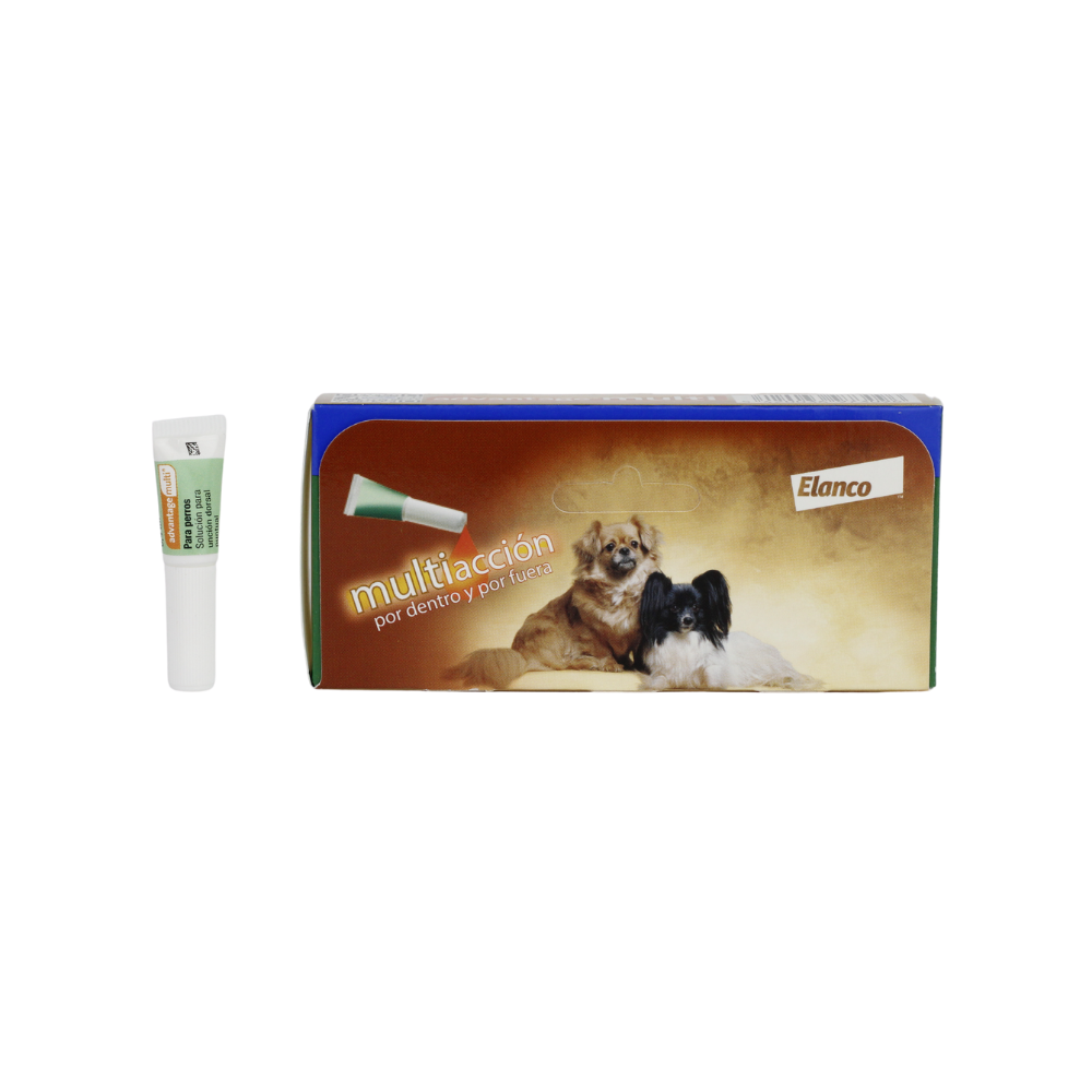 advantage multi para perros de 1 a 4 kg es un antiparasitario tópico de amplio espectro que previene y trata infestaciones por pulgas, gusanos intestinales, ácaros y el gusano del corazón con una sola aplicación mensual.