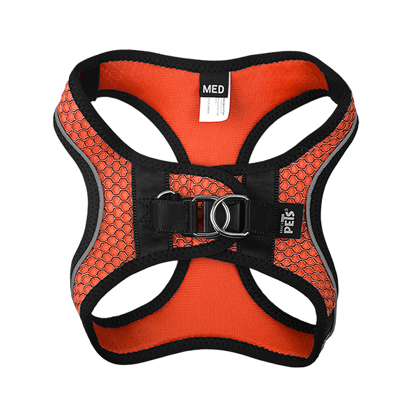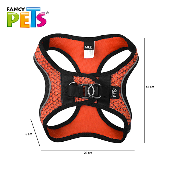 el fancy pets arnés y correa sportie mediano naranja está diseñado para ofrecer un ajuste cómodo y seguro a perros medianos durante sus paseos diarios. el arnés tipo pechera está fabricado con materiales resistentes y suaves, con un interior acolchado y malla transpirable que mantiene fresca y cómoda a la mascota, incluso en climas cálidos.