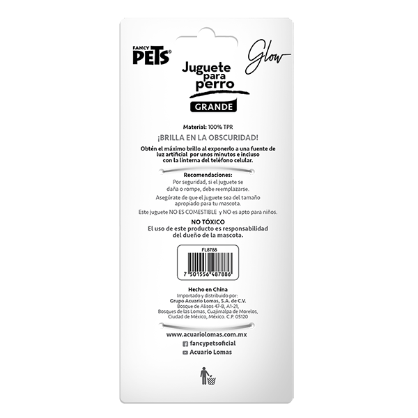 el fancy?pets glow pesa grande está fabricado en 100?% tpr (caucho termoplástico), un material suave pero resistente al mordisco. su diseño con forma de pesa permite un agarre fácil y fortalece la mandíbula durante la interacción. funciona como juguete flotante, ideal para sesiones de juego en agua. su característica más llamativa es su capacidad para brillar tras exponerse a luz artificial (incluso una linterna), lo que lo convierte en una opción divertida para juegos nocturnos o en exteriores. es seguro, no tóxico, y adecuado para perros medianos y grandes.