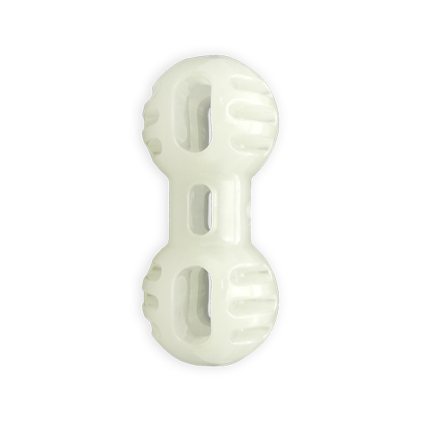 juguete masticable con forma de pesa que brilla en la oscuridad, diseñado para estimular el juego y el ejercicio en perros activos, especialmente en condiciones de poca luz.
