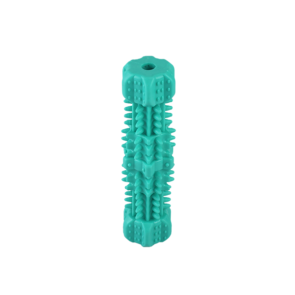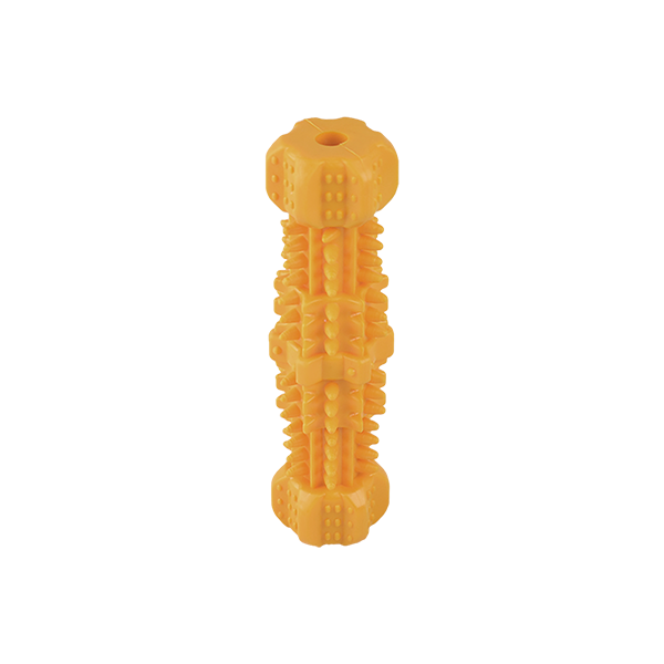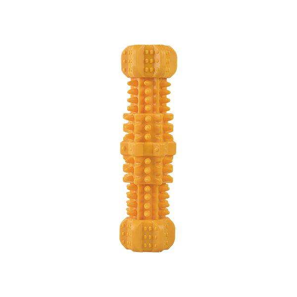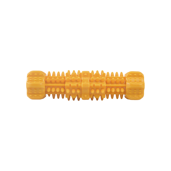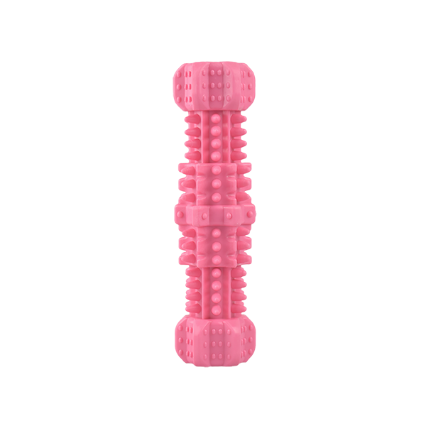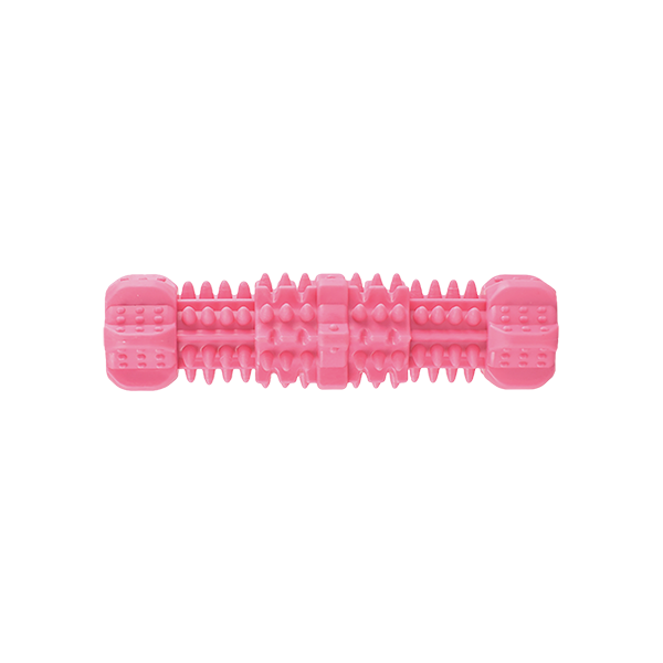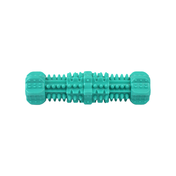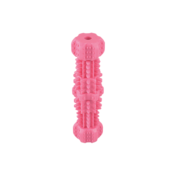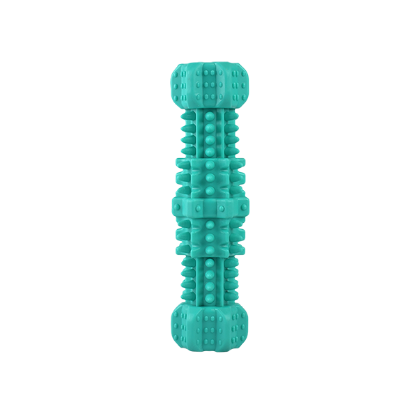 juguete de caucho en forma de mancuerna con textura spiky, ideal para perros fuertes y activos que disfrutan morder y ejercitarse.