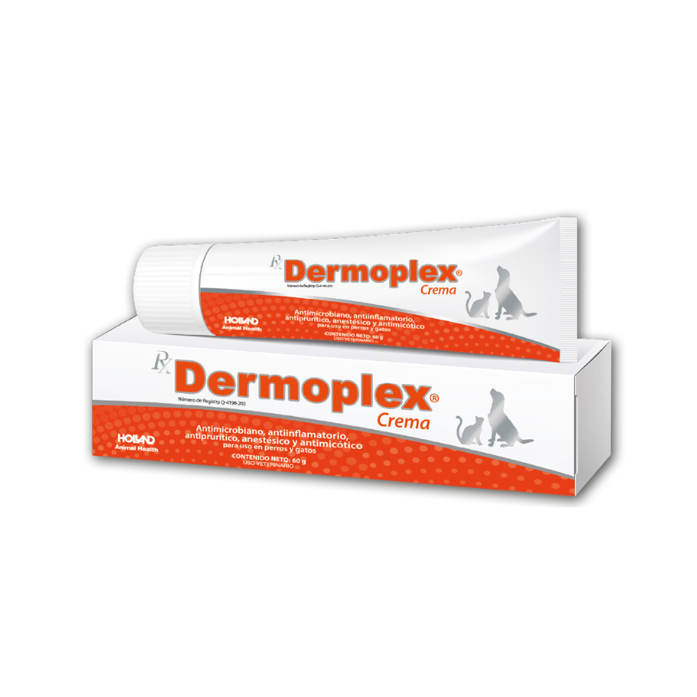 Holland Dermoplex Crema es un producto de uso veterinario formulado para el manejo tópico de problemas dermatológicos en perros y gatos. Está indicada como apoyo en casos de irritación, resequedad, enrojecimiento o lesiones cutáneas superficiales. Su acción contribuye a hidratar, proteger y favorecer la recuperación de la piel, formando parte de un manejo integral bajo supervisión del médico veterinario.