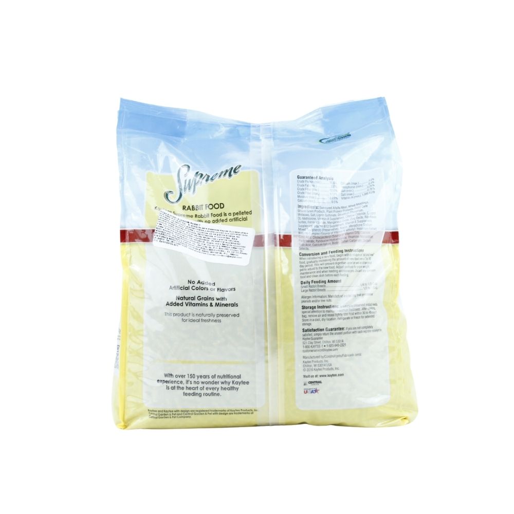 kaytee supreme es un alimento premium en forma de pellets, formulado para proporcionar una dieta natural y equilibrada a conejos adultos, sin colorantes ni sabores artificiales, y conservado de manera natural para mantener su frescura.