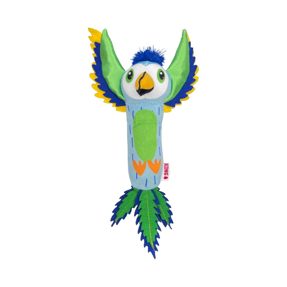 kong el cuerpo flexible de tropics bird y las alas y las plumas de la cola invitan a los gatos a luchar y batear para un montón de ejercicio saludable de cuerpo completo. embalado con hierba gatera norteamericana kong premium para prolongar el juego, las texturas brillantes y variadas de satén, felpa, fieltro y mechones intrigan a los gatos. el cuerpo y las alas arrugados despiertan instintos de caza para un aleteo de diversión tropical.