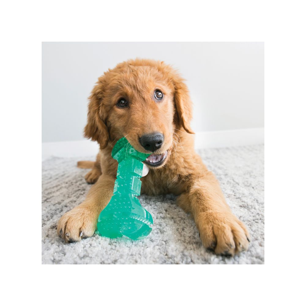 los juguetes kong dental squeezz satisfacen la necesidad instintiva de masticar de los perros, ya que sus protuberancias texturizadas recompensan el comportamiento adecuado mientras limpian los dientes.