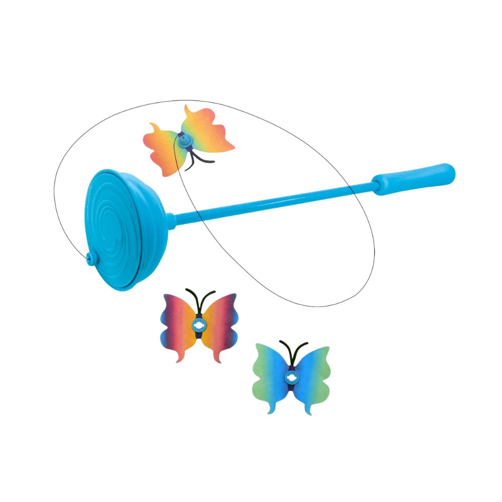 la acción de aleteo y revoloteo de kong purrsuit teaser imita el vuelo natural de la mariposa, lo que desencadena los instintos de acecho y salto de un gato. incluye tres mariposas intercambiables que recompensan el juego de agarrar y capturar. amplíe la diversión cambiando el patrón de vuelo cambiando el ángulo de la varita y proporcione una variedad infinita de juegos. la diversión interactiva también se puede variar mediante el uso de modos automáticos o manuales. incluye tres juguetes intercambiables y baterías.