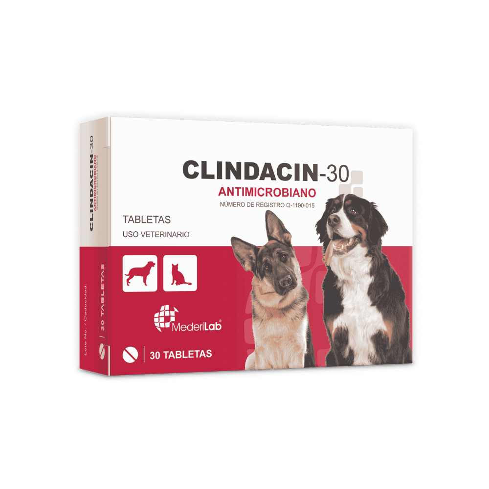 Mederilab Clindacin-30 es un antibiótico de amplio uso veterinario formulado con clindamicina, indicado para el tratamiento de infecciones causadas por bacterias sensibles en perros y gatos. Está recomendado en infecciones de piel y tejidos blandos, cavidad oral, huesos, articulaciones, heridas infectadas y procesos dentales, así como en ciertas infecciones sistémicas.