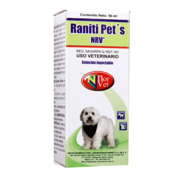 raniti pet´s nrv* está indicado en la prevención y tratamiento de gastritis crónica, úlcera gástrica y úlcera duodenal, esofagitis por reflujo gastroesofágico, síndrome de zollinger-ellison, gastritis erosiva iatrogénica medicamentosa o por estrés y en general en cualquier estado donde se requiera un control efectivo de la secreción de ácido clorhídrico.
