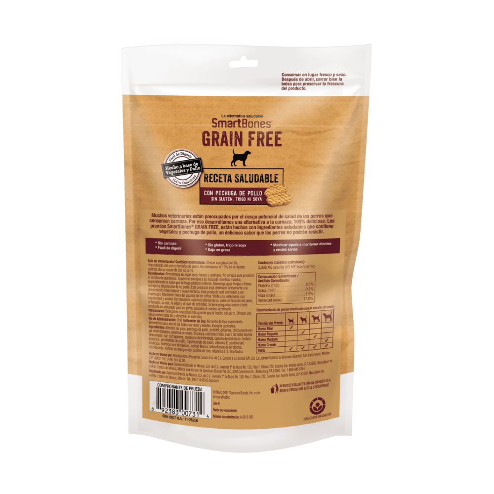 SmartBones Grain Free es un premio masticable que contiene pechuga de pollo. La alternativa saludable ideal para aquellos perrito alérgicos al gluten, trigo o soya. Estos premios están libre de colorantes, saborizantes y conservantes artificiales. Son masticables que no contiene carnaza, por lo que ayudará a tu mascota a mantener dientes y encías saludables. Este delicioso premio está enriquecido con vitaminas y minerales, además de que por sus ingredientes son fáciles de digerir. Recomendado para todas las razas.